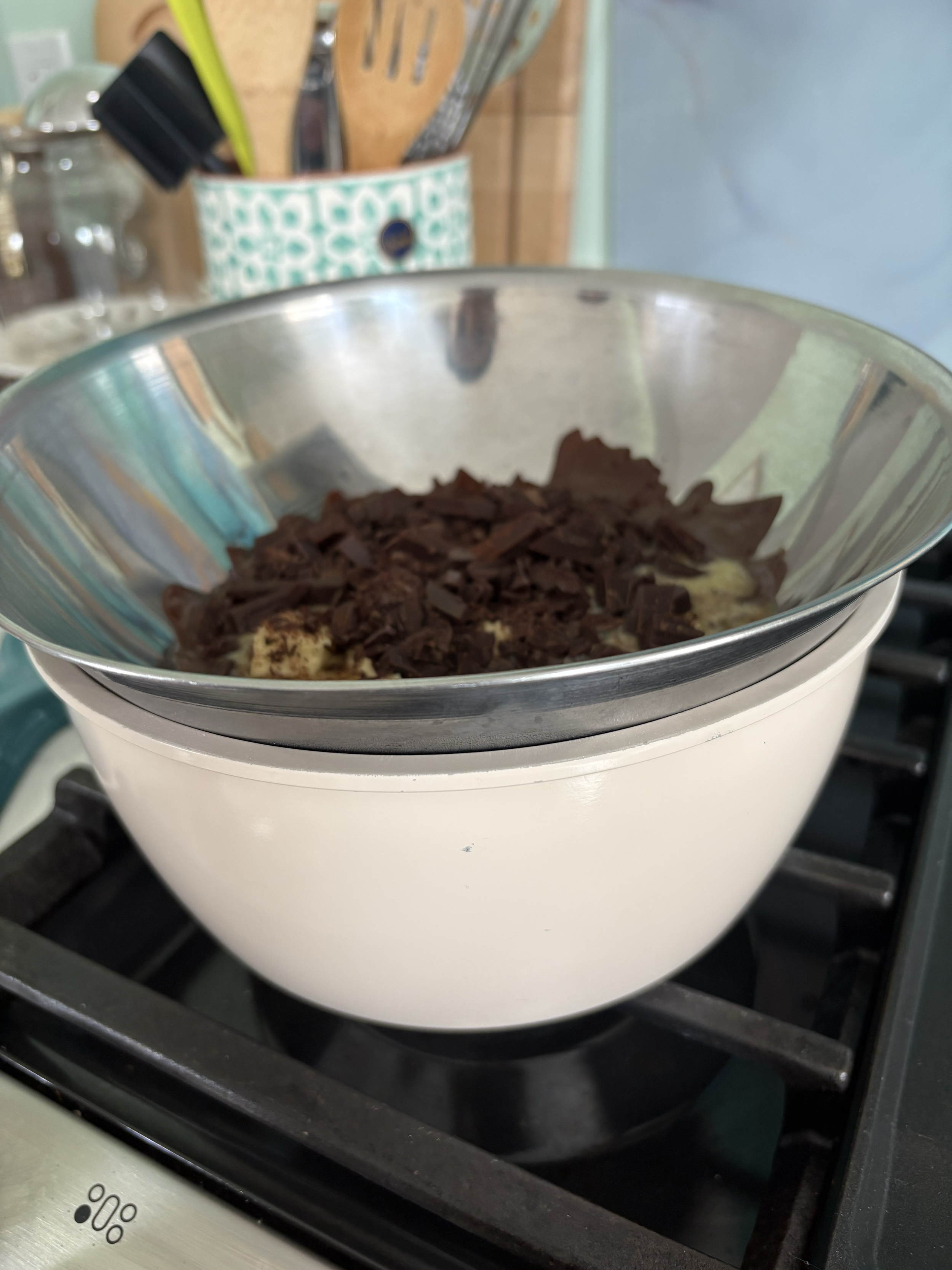 Add cocoa, espresso, and salt to the chocolate - UNTIL JUST COMBINED!